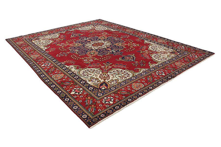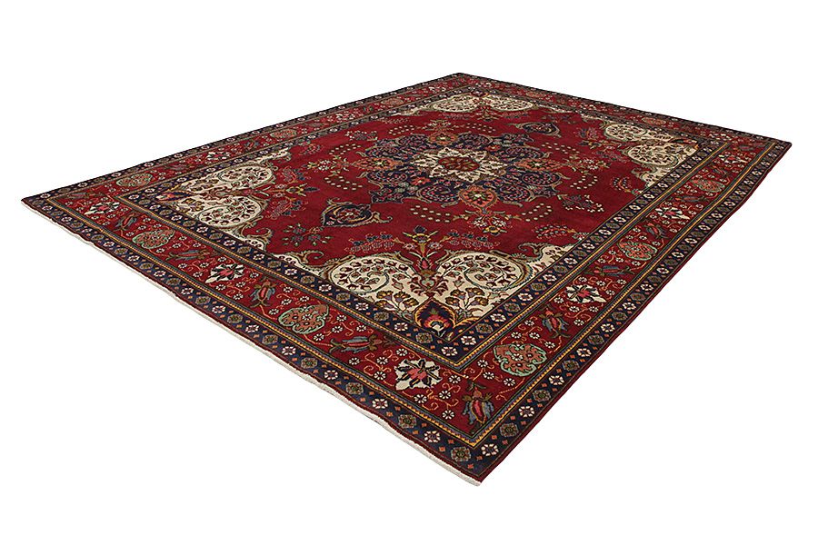 Alfombras Tabriz: La ciudad de Tabriz es la capital de la provincia de Azerbaiyán en el suroeste de Irán. Hasta el final de la época de las caravanas fue el centro más importante de tejido y mercado de las alfombras Tabriz. El Occidente compraba aquí las obras maestras creadas por los tejedores renombrados y capacitados. Se conocieron en los mercados internacionales por su alta calidad. Se crearon talleres de alfombras tejidas a mano, donde se tejían diseños antiguos y modernos anudados con densidad y meteriales de alta calidad. La seda y la lana fina de primera clase dan una alta calidad a las alfombras. Ninguna ciudad persa tenía una producción tan grande y amplia de alfombras. Con o sin medallón, sus motivos son excepcionales y llenos de fantasía. Flores, representaciones y versos de poemas también decoran las alfombras. Los colores predominantes son el beige, el azul y el rojo.