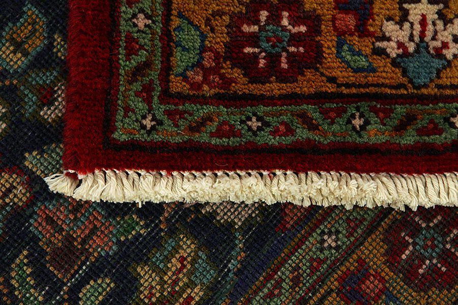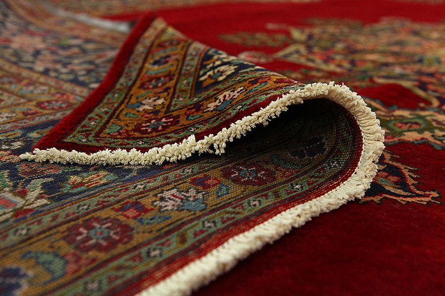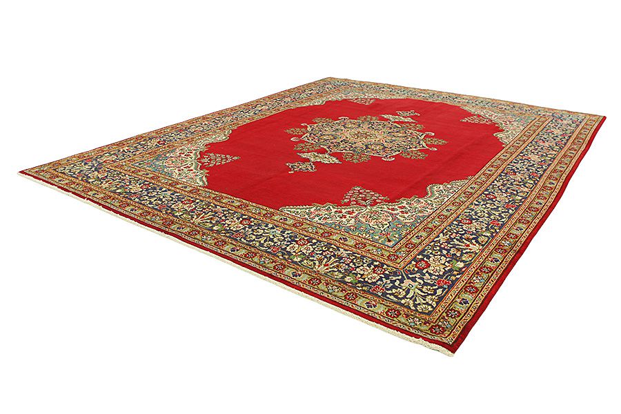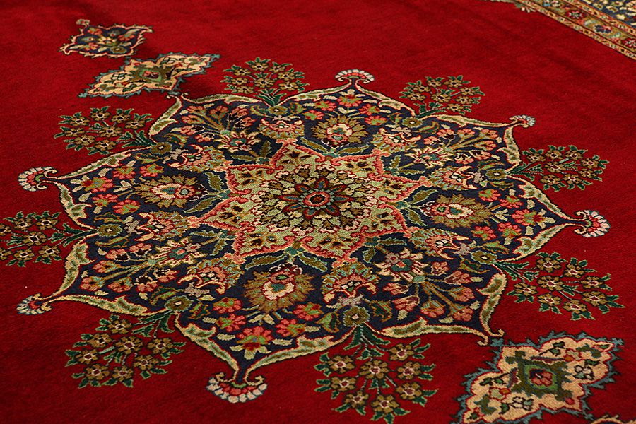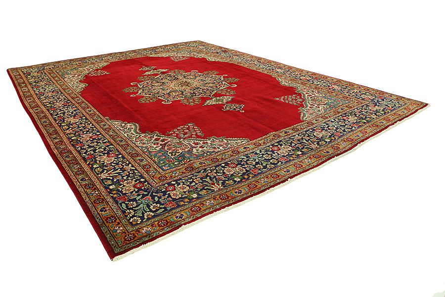 Alfombras Tabriz: La ciudad de Tabriz es la capital de la provincia de Azerbaiyán en el suroeste de Irán. Hasta el final de la época de las caravanas fue el centro más importante de tejido y mercado de las alfombras Tabriz. El Occidente compraba aquí las obras maestras creadas por los tejedores renombrados y capacitados. Se conocieron en los mercados internacionales por su alta calidad. Se crearon talleres de alfombras tejidas a mano, donde se tejían diseños antiguos y modernos anudados con densidad y meteriales de alta calidad. La seda y la lana fina de primera clase dan una alta calidad a las alfombras. Ninguna ciudad persa tenía una producción tan grande y amplia de alfombras. Con o sin medallón, sus motivos son excepcionales y llenos de fantasía. Flores, representaciones y versos de poemas también decoran las alfombras. Los colores predominantes son el beige, el azul y el rojo.