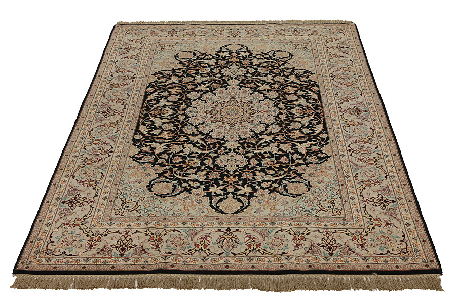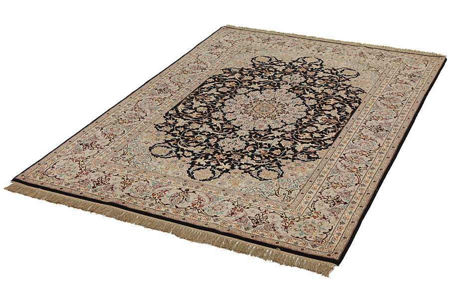 Alfombras Isfahan: En el centro de Irán, ente las montañas Zagros y el desierto, se encuentra la ciudad de Isfahan. Hoy en día, es una importante ciudad industrial con una población de 1,2 millones de habitantes. En cuanto a su arquitectura, la ciudad es una obra maestra. La plaza de Imam con sus mezquitas (Lotfollah y Ali Qapo), los palacios, los parques y los puentes antiguos, está rodeada por tiendas de miniaturas y alfombras, joyerías y casas de té. Todo esto crea un atmósfera de verdadro Oriente. Las antiguasalfombras de Isfahan, por el contrario de las nuevos, no tenían medallón en el centro. Por toda la superficie había flores primorosas y palmetas. Las nuevas alfombras Isfahan no se pueden comparar con las antiguas, tejidas exclusivamente paralos aristócratas. Sin embargo, siguiendo la tradición, las nuevas alfombras Isfahan son muy finas, y el pelo se corta mucho para que se vean mejor las figuras. En el tejido usan también seda, principalmente en las flores. La urdimbre es de lana o dealgodón.