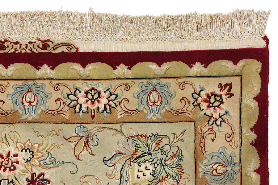 Alfombras Tabriz: La ciudad de Tabriz es la capital de la provincia de Azerbaiyán en el suroeste de Irán. Hasta el final de la época de las caravanas fue el centro más importante de tejido y mercado de las alfombras Tabriz. El Occidente compraba aquí las obras maestras creadas por los tejedores renombrados y capacitados. Se conocieron en los mercados internacionales por su alta calidad. Se crearon talleres de alfombras tejidas a mano, donde se tejían diseños antiguos y modernos anudados con densidad y meteriales de alta calidad. La seda y la lana fina de primera clase dan una alta calidad a las alfombras. Ninguna ciudad persa tenía una producción tan grande y amplia de alfombras. Con o sin medallón, sus motivos son excepcionales y llenos de fantasía. Flores, representaciones y versos de poemas también decoran las alfombras. Los colores predominantes son el beige, el azul y el rojo.