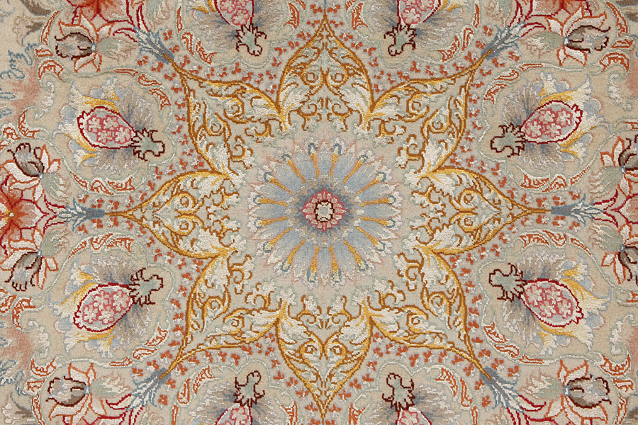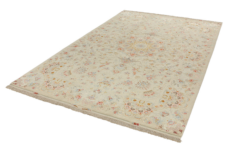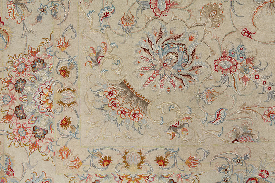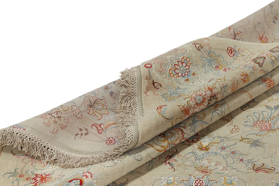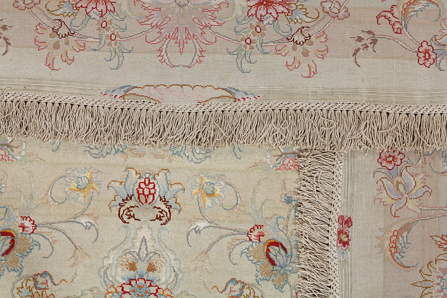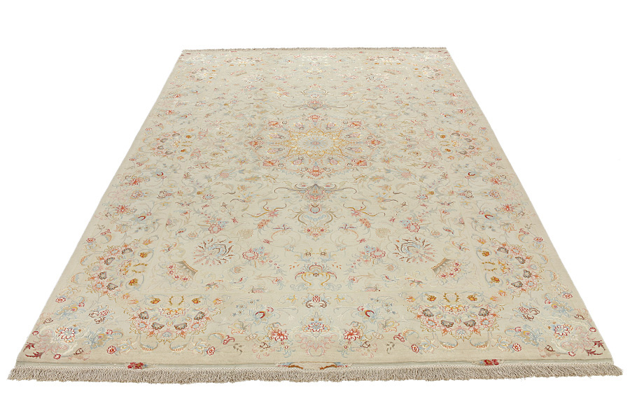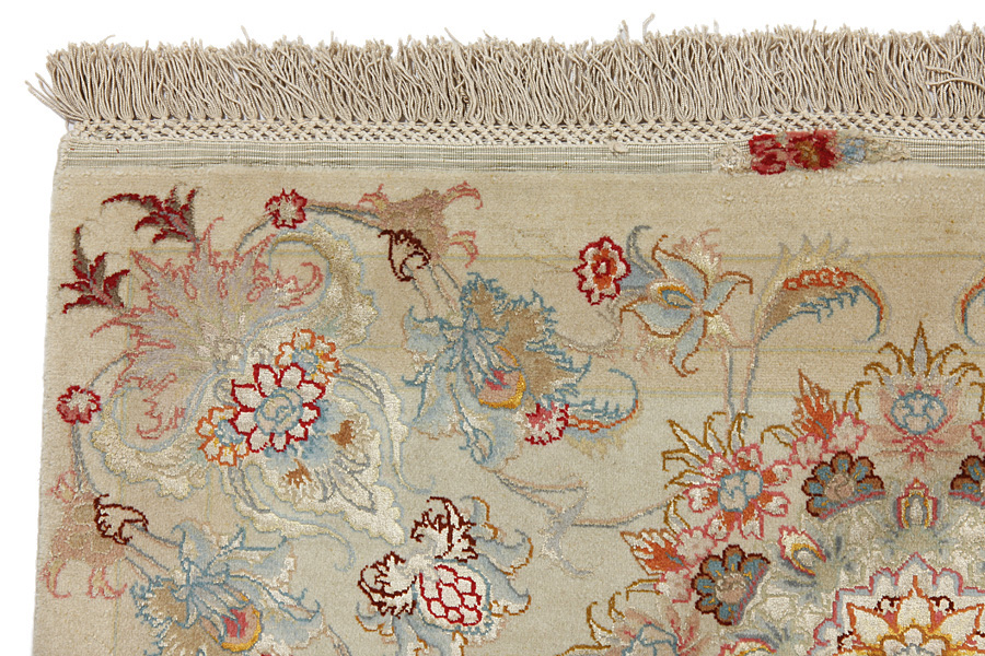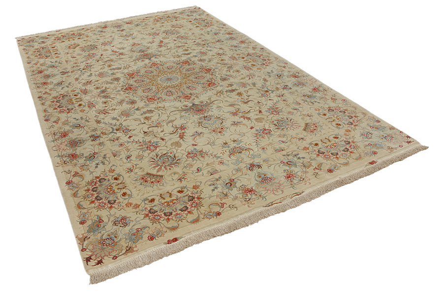 Alfombras Tabriz: La ciudad de Tabriz es la capital de la provincia de Azerbaiyán en el suroeste de Irán. Hasta el final de la época de las caravanas fue el centro más importante de tejido y mercado de las alfombras Tabriz. El Occidente compraba aquí las obras maestras creadas por los tejedores renombrados y capacitados. Se conocieron en los mercados internacionales por su alta calidad. Se crearon talleres de alfombras tejidas a mano, donde se tejían diseños antiguos y modernos anudados con densidad y meteriales de alta calidad. La seda y la lana fina de primera clase dan una alta calidad a las alfombras. Ninguna ciudad persa tenía una producción tan grande y amplia de alfombras. Con o sin medallón, sus motivos son excepcionales y llenos de fantasía. Flores, representaciones y versos de poemas también decoran las alfombras. Los colores predominantes son el beige, el azul y el rojo.