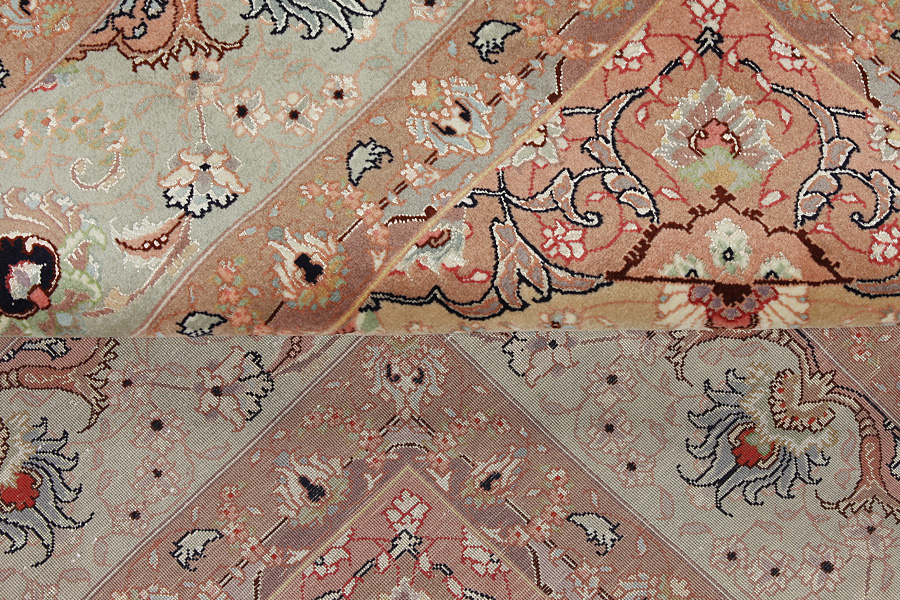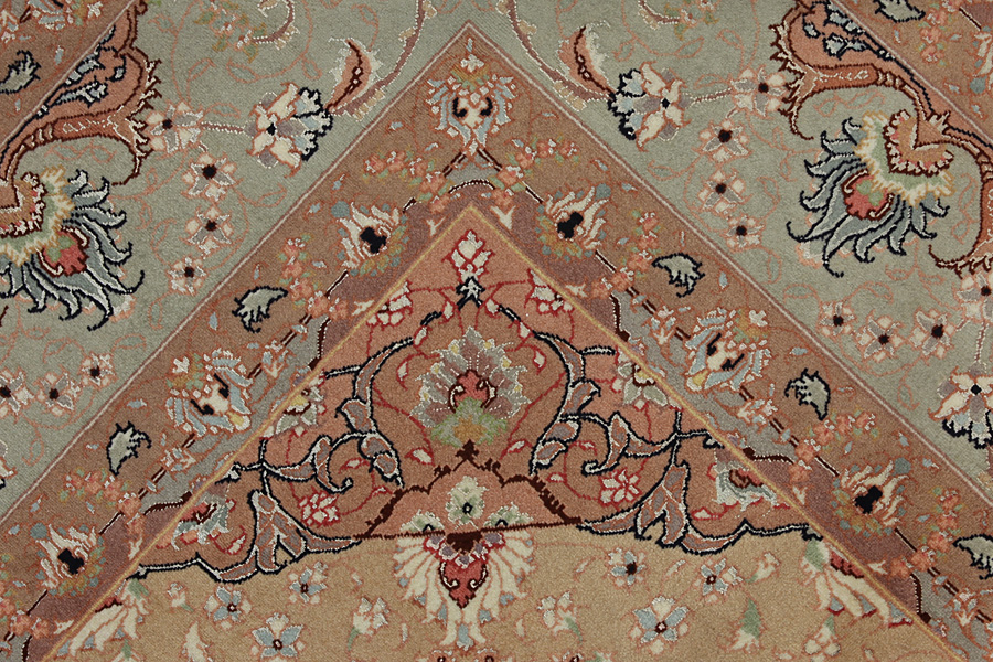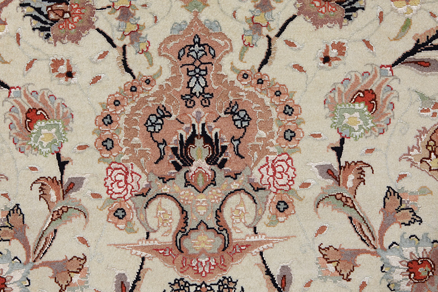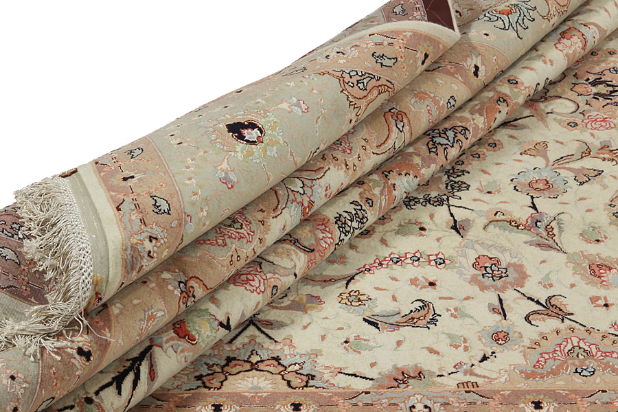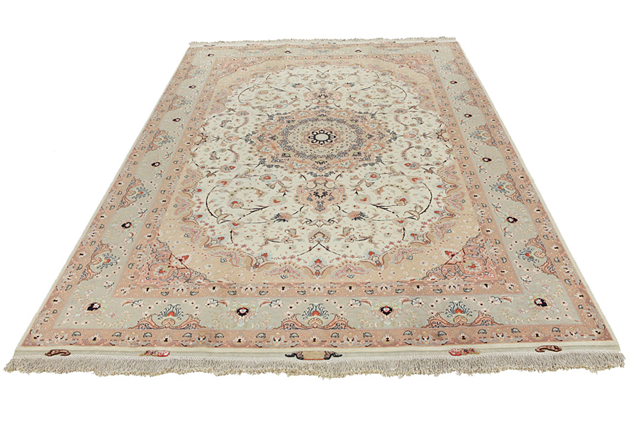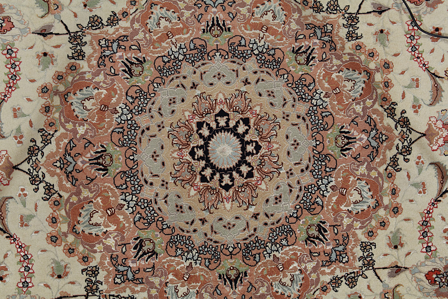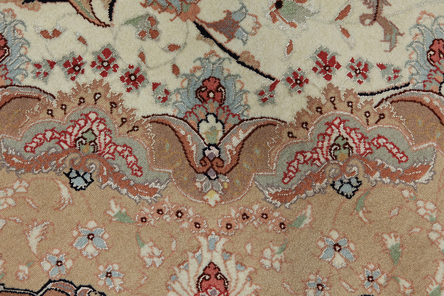 Alfombras Tabriz: La ciudad de Tabriz es la capital de la provincia de Azerbaiyán en el suroeste de Irán. Hasta el final de la época de las caravanas fue el centro más importante de tejido y mercado de las alfombras Tabriz. El Occidente compraba aquí las obras maestras creadas por los tejedores renombrados y capacitados. Se conocieron en los mercados internacionales por su alta calidad. Se crearon talleres de alfombras tejidas a mano, donde se tejían diseños antiguos y modernos anudados con densidad y meteriales de alta calidad. La seda y la lana fina de primera clase dan una alta calidad a las alfombras. Ninguna ciudad persa tenía una producción tan grande y amplia de alfombras. Con o sin medallón, sus motivos son excepcionales y llenos de fantasía. Flores, representaciones y versos de poemas también decoran las alfombras. Los colores predominantes son el beige, el azul y el rojo.