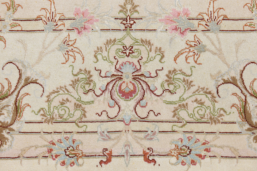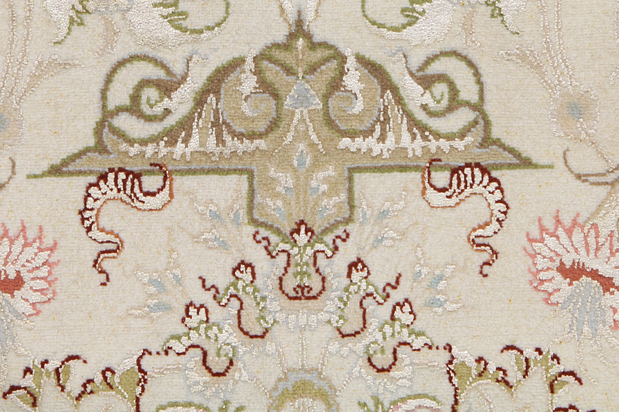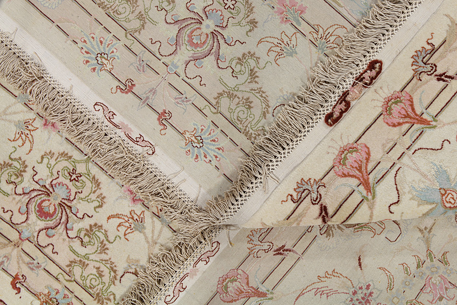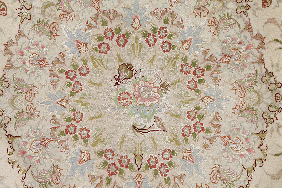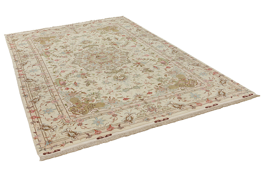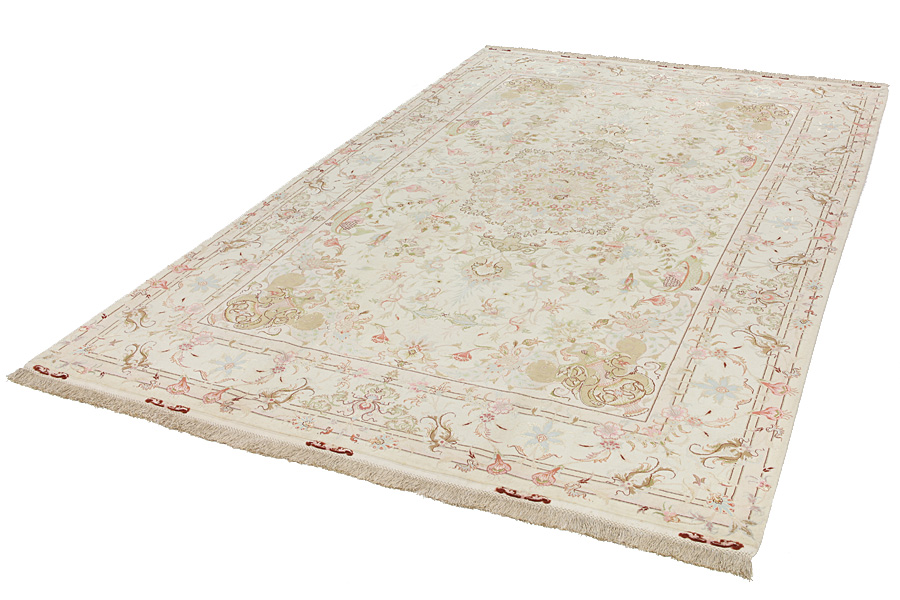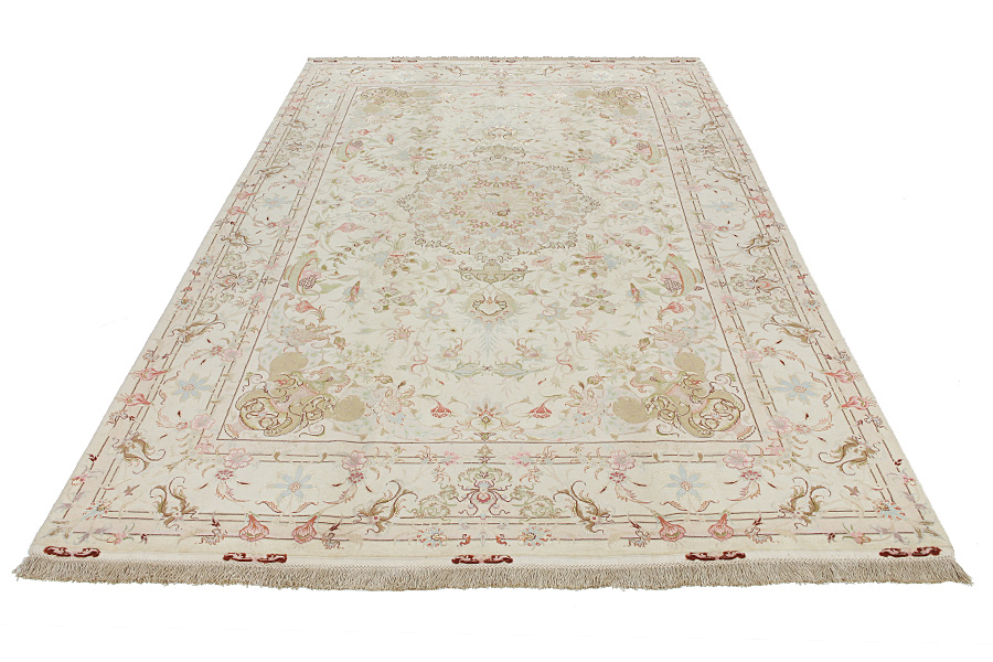 Alfombras Tabriz: La ciudad de Tabriz es la capital de la provincia de Azerbaiyán en el suroeste de Irán. Hasta el final de la época de las caravanas fue el centro más importante de tejido y mercado de las alfombras Tabriz. El Occidente compraba aquí las obras maestras creadas por los tejedores renombrados y capacitados. Se conocieron en los mercados internacionales por su alta calidad. Se crearon talleres de alfombras tejidas a mano, donde se tejían diseños antiguos y modernos anudados con densidad y meteriales de alta calidad. La seda y la lana fina de primera clase dan una alta calidad a las alfombras. Ninguna ciudad persa tenía una producción tan grande y amplia de alfombras. Con o sin medallón, sus motivos son excepcionales y llenos de fantasía. Flores, representaciones y versos de poemas también decoran las alfombras. Los colores predominantes son el beige, el azul y el rojo.
