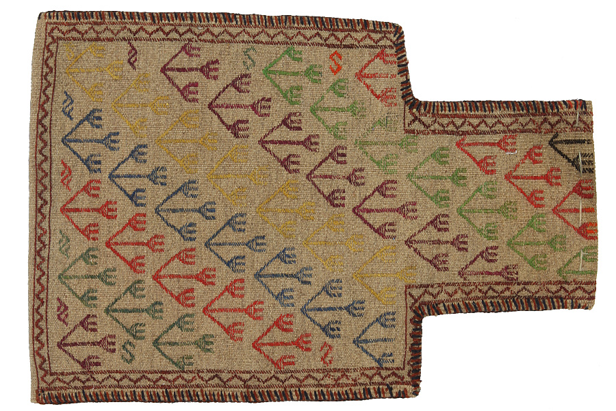 Alfombras Saddle Bag: ​​​ Las alforjas de caballos (bolsas de caballo) son hechas por los nómadas para su propio uso. Se puede distinguir entre las alforjas-kilim de caballo y las alforjas de caballo anudadas. El lado frontal de una alforja de caballo anudada es anudada como una alfombra de nudos común o se teje utilizando una mezcla de diferentes técnicas.Las partes laterales son a menudo tejidas, mientras que en la parte central se aplican diferentes técnicas de tejido tales como kelim o Soumak. Los colores de las alforjas de caballo se tiñen con colores naturales que son hechas por los nómadas sí mismos. Estas bolsas se utilizaron para transportar las necesidades diarias de los viajeros en burros o caballos. Una pieza de arte que dota a su hogar de un ambiente oriental único. Las alforjas de caballo se pueden utilizar como un cojín de silla, como un cojín sobre el piso por ejemplo en frente a una chimenea, o para decorar una pared. Las pequeñas alforjas/bolsas del caballo se pueden utilizar como porta-revistas para almacenar revistas o periódicos cuando están colocadas sobre una silla o un sofá.