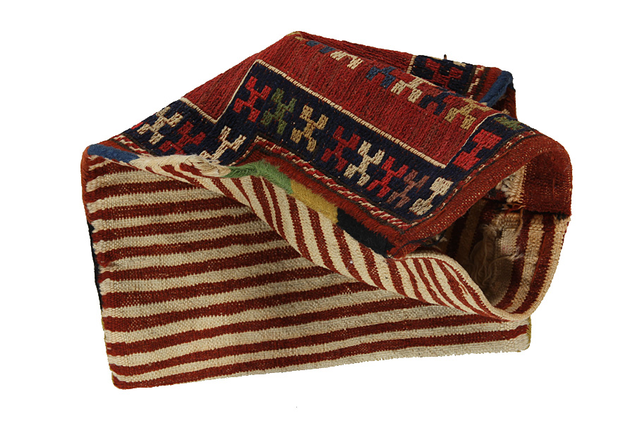Alfombras Saddle Bag: ​​​ Las alforjas de caballos (bolsas de caballo) son hechas por los nómadas para su propio uso. Se puede distinguir entre las alforjas-kilim de caballo y las alforjas de caballo anudadas. El lado frontal de una alforja de caballo anudada es anudada como una alfombra de nudos común o se teje utilizando una mezcla de diferentes técnicas.Las partes laterales son a menudo tejidas, mientras que en la parte central se aplican diferentes técnicas de tejido tales como kelim o Soumak. Los colores de las alforjas de caballo se tiñen con colores naturales que son hechas por los nómadas sí mismos. Estas bolsas se utilizaron para transportar las necesidades diarias de los viajeros en burros o caballos. Una pieza de arte que dota a su hogar de un ambiente oriental único. Las alforjas de caballo se pueden utilizar como un cojín de silla, como un cojín sobre el piso por ejemplo en frente a una chimenea, o para decorar una pared. Las pequeñas alforjas/bolsas del caballo se pueden utilizar como porta-revistas para almacenar revistas o periódicos cuando están colocadas sobre una silla o un sofá.