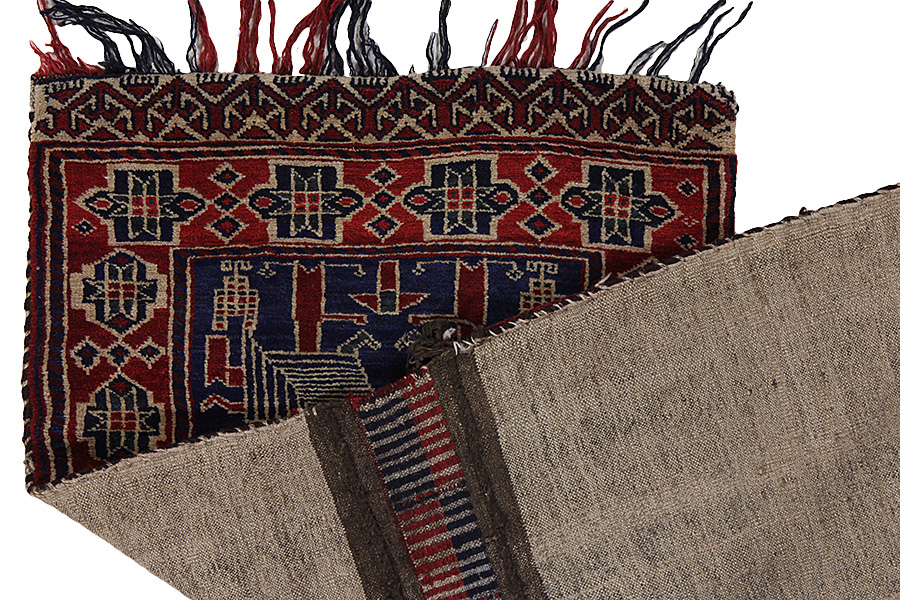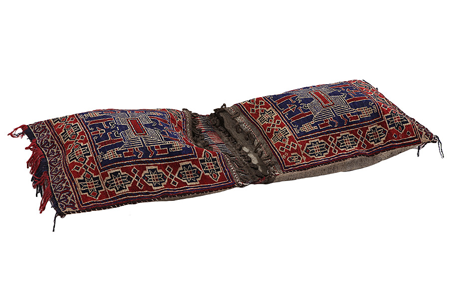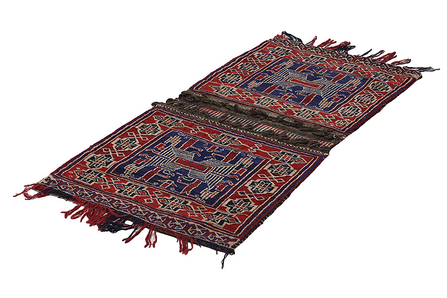 Alfombras Saddle Bag: Las alforjas de caballos (bolsas de caballo) son hechas por los nómadas para su propio uso. Se puede distinguir entre las alforjas-kilim de caballo y las alforjas de caballo anudadas. El lado frontal de una alforja de caballo anudada es anudada como una alfombra de nudos común o se teje utilizando una mezcla de diferentes técnicas.Las partes laterales son a menudo tejidas, mientras que en la parte central se aplican diferentes técnicas de tejido tales como kelim o Soumak. Los colores de las alforjas de caballo se tiñen con colores naturales que son hechas por los nómadas sí mismos. Estas bolsas se utilizaron para transportar las necesidades diarias de los viajeros en burros o caballos. Una pieza de arte que dota a su hogar de un ambiente oriental único. Las alforjas de caballo se pueden utilizar como un cojín de silla, como un cojín sobre el piso por ejemplo en frente a una chimenea, o para decorar una pared. Las pequeñas alforjas/bolsas del caballo se pueden utilizar como porta-revistas para almacenar revistas o periódicos cuando están colocadas sobre una silla o un sofá.